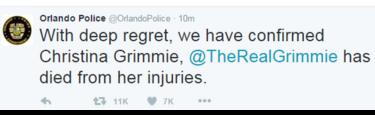 In a tweet, Orlando's police wrote: "With deep regret, we have confirmed Christina Grimmie, @TheRealGrimmie has died from her injuries."